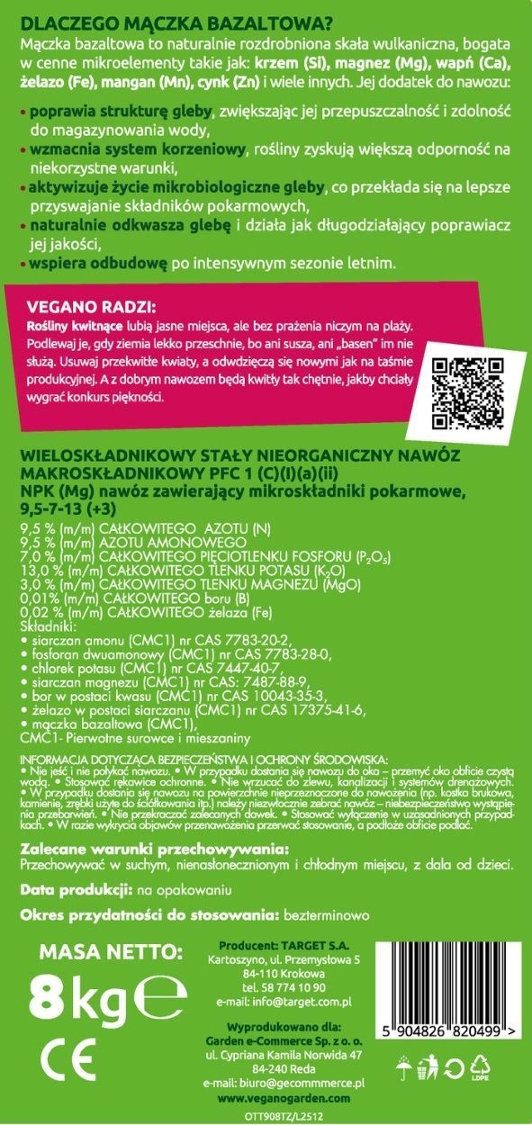 Nawóz z mączką bazaltową do Roślin Kwitnących – Róże, Hortensje, Piwonie Vegano 8 kg