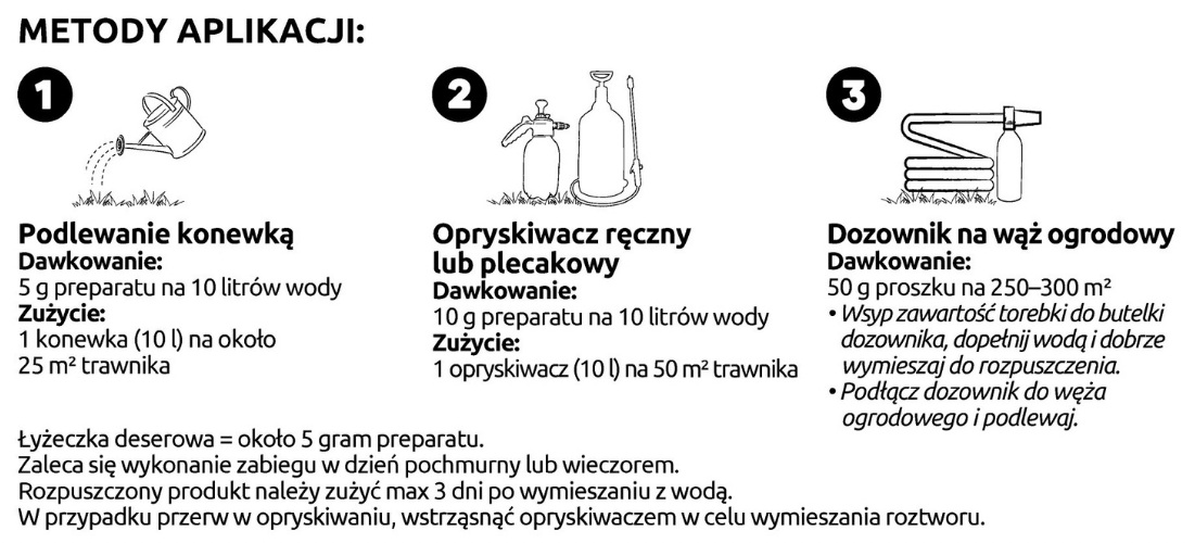 - Opryskiwacz ręczny lub plecakowy - 5 g proszku na 10 l wody