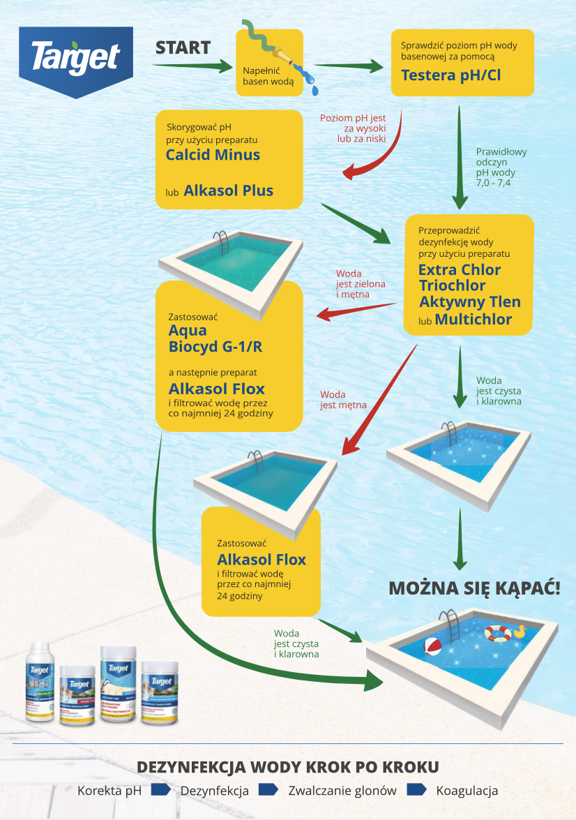 - W przypadku basenu napełnionego wodą o jakości wody pitnej, zalecamy utrzymanie pH w zakresie od 7,2 do 7,6.