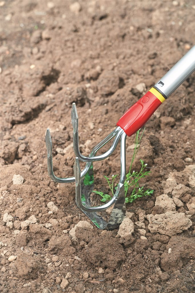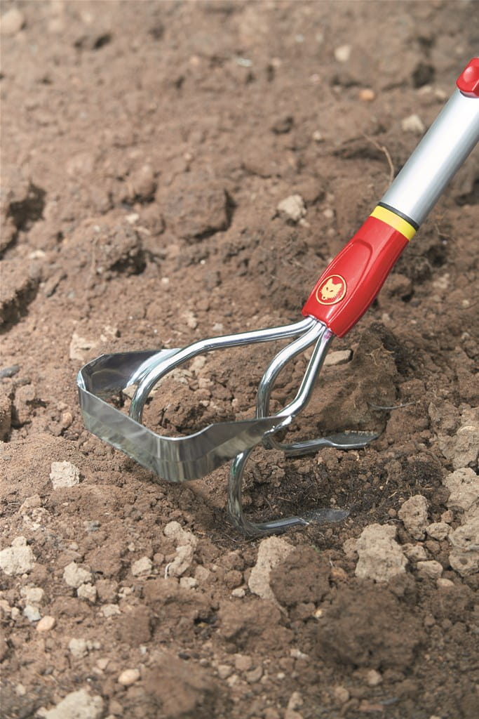 To podwójne narzędzie, o szerokości roboczej wynoszącej 10 cm wyposażone jest w trzy zęby do gruntownego spulchniania oraz napowietrzania i ostry nóż do plewienia, pozwalający bezproblemowo odciąć pojedyncze chwasty.