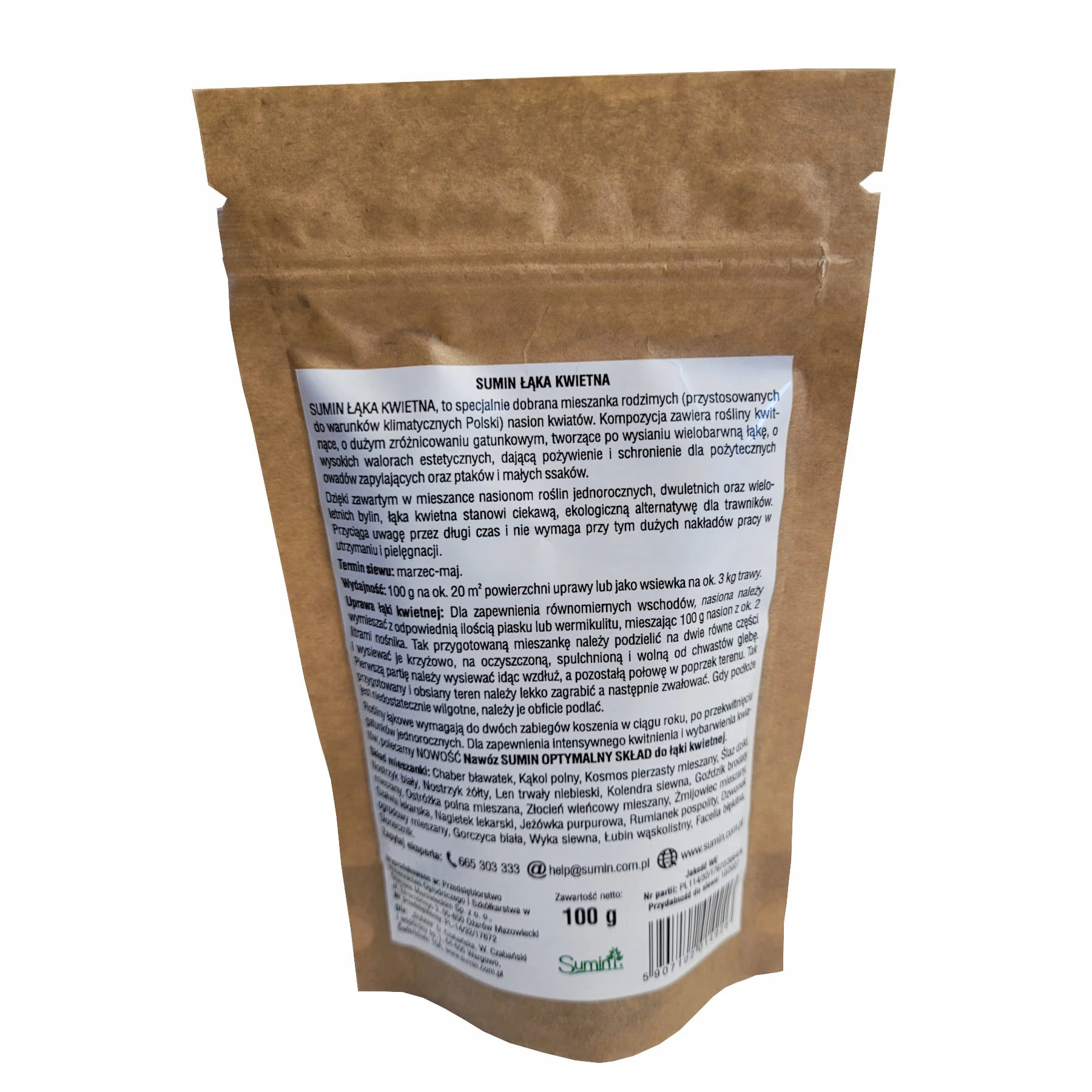 Łąka kwietna Sumin, to specjalnie dobrana mieszanka rodzimych (przystosowanych do warunków klimatycznych Polski) nasion kwiatów. Kompozycja zawiera rośliny kwitnące , o dużym zróżnicowaniu gatunkowym, tworzące po wsianiu wielobarwną łąkę, o walorach estetycznych, dającą pożywienie i schronienie dla pożytecznych