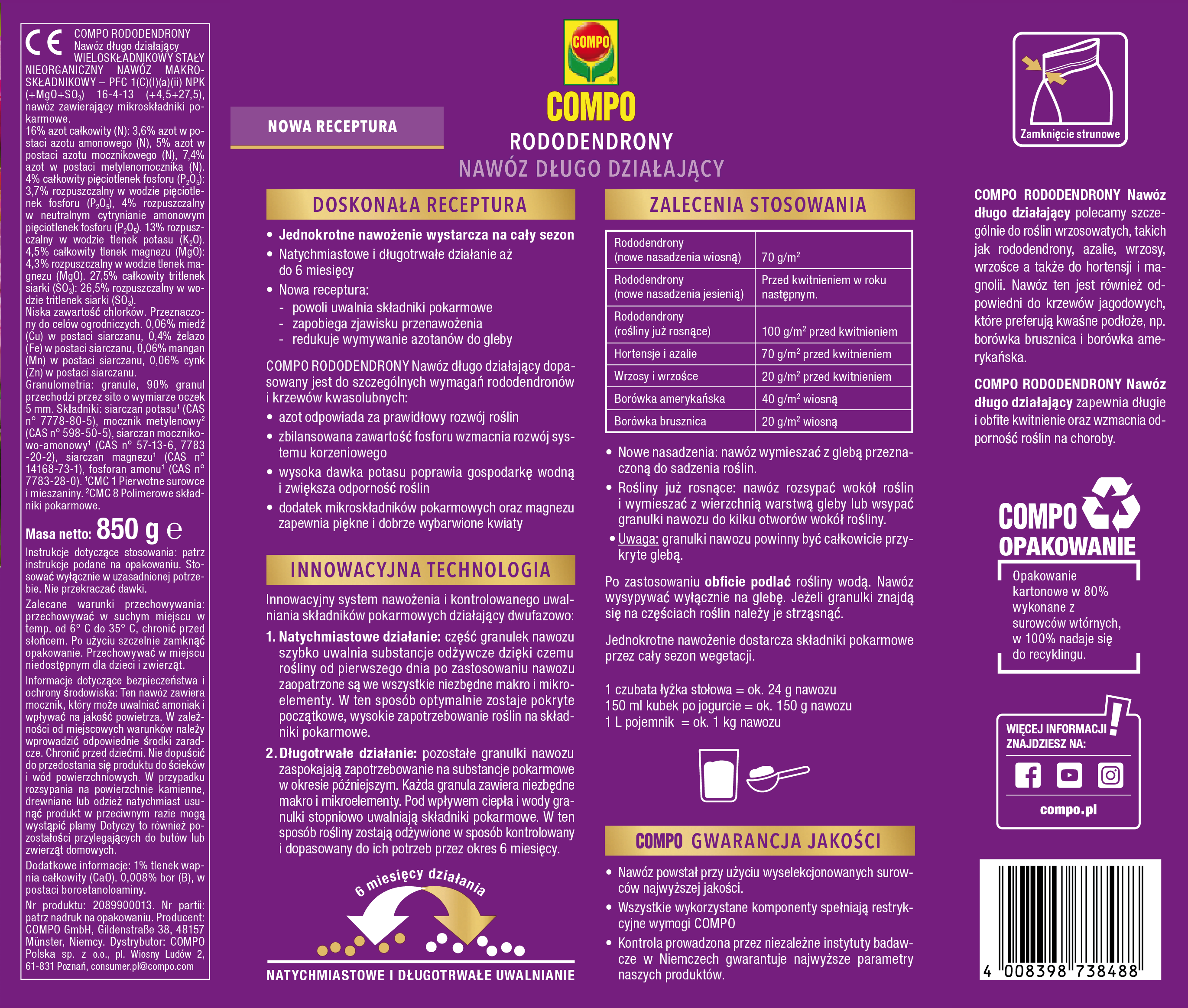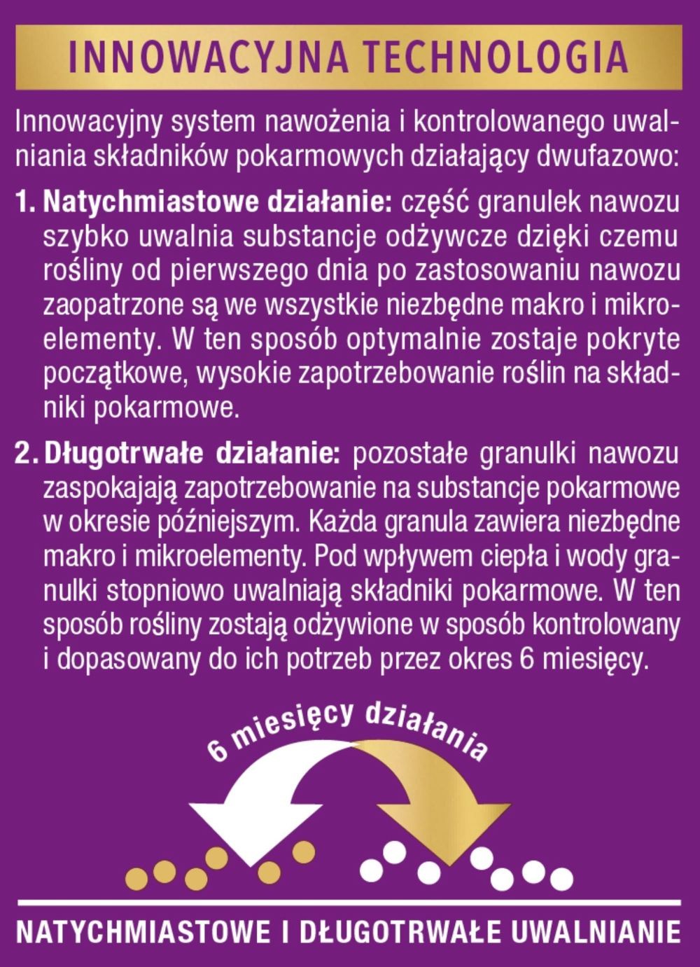 Specjalistyczny preparat przeznaczony do roślin kwaśnolubnych takich jak: hortensje, azalie i rododendrony. Dzięki formule o kontrolowanym uwalnianiu składników odżywczych zapewnia roślinom stałe i zrównoważone odżywianie aż do 6 miesięcy. Odpowiednio dobrany skład wspiera intensywny wzrost, sprzyja obfitemu kwitnieniu oraz pomaga utrzymać odpowiednie pH gleby, co jest kluczowe dla zdrowego rozwoju wymagających roślin. Nawóz wzmacnia system korzeniowy i poprawia odporność na niekorzystne warunki.