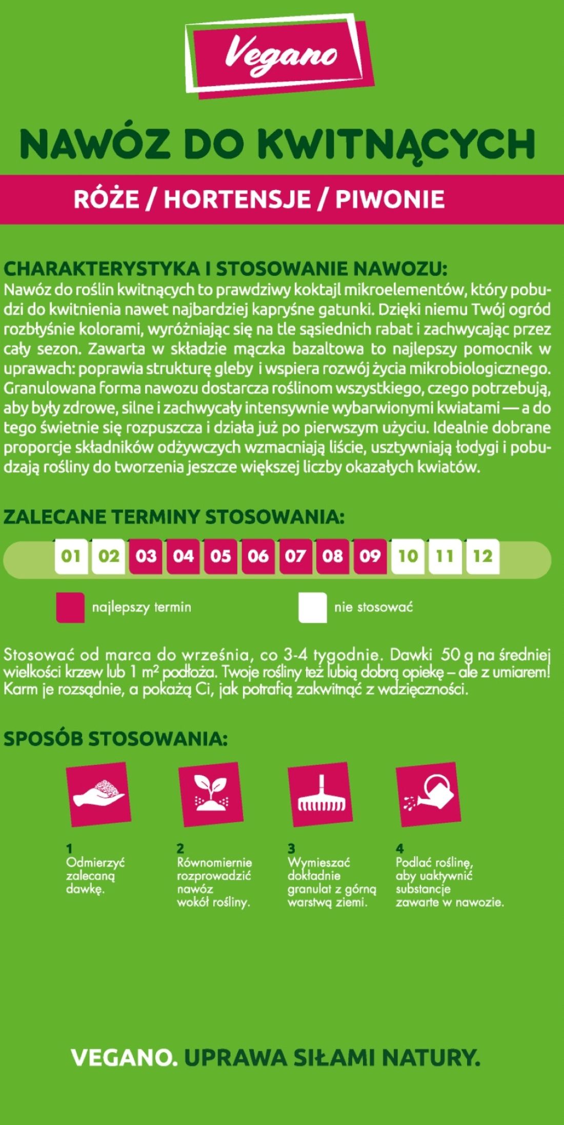- 50 g nawozu na średniej wielkości krzew lub 1m² podłoża