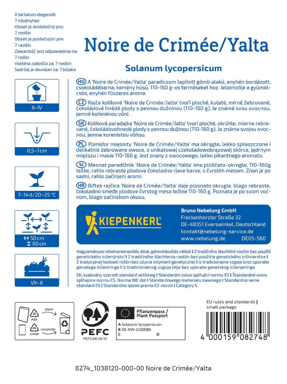 Pomidor mięsisty Noire de Crimée/Yalta to jedna z najbardziej cenionych odmian typu “ciemnych pomidorów”, uwielbiana za swoj niepowtarzalny smak oraz wyjątkowy, głęboki kolor owoców. Dorodne, lekko spłaszczone i mięsiste pomidory wyróżniają się intensywną barwą - od mahoniowej po purpurowo-brązową, która pięknie prezentuje się w sałatkach i na świeżych przekąskach. Owoce tej odmiany są duże, soczyste i niezwykle aromatyczne. Mają bogaty, lekko słodkawy, głęboki smak. Rośliny są wysokorosnące, zdrowe i dobrze plonują nawet w mniej sprzyjających warunkach. Najlepiej rosną w tunelach lub na słonecznych, ciepłych stanowiskach w gruncie. Odmiana ceniona jest za obfite owocowanie, dobrą tolerancję na warunki pogodowe i wyjątkową jakość plonu.