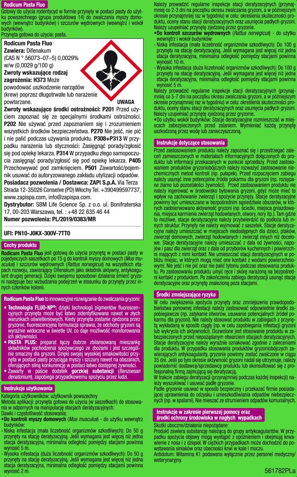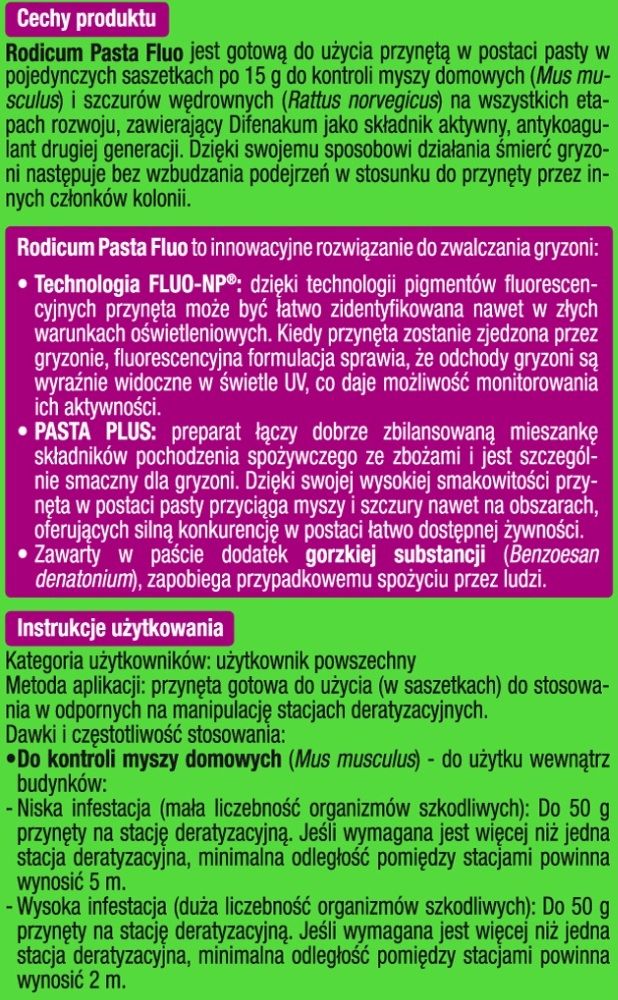 Pasta przeznaczona jest do skutecznego zwalczania myszy domowych (Mus Musculus) i szczurów wędrownych (Rattus norvegicus) na każdym etapie rozwoju. Produkt został wzbogacony o fluorescencyjny barwnik, dzięki czemu pozostawiane przez szkodniki ślady można z łatwością wykryć w świetle UV. Pozwala to szybko zlokalizować miejsca ich aktywności i jeszcze skuteczniej przeprowadzić deratyzację. Należy stosować w stacjach deratyzacyjnych.