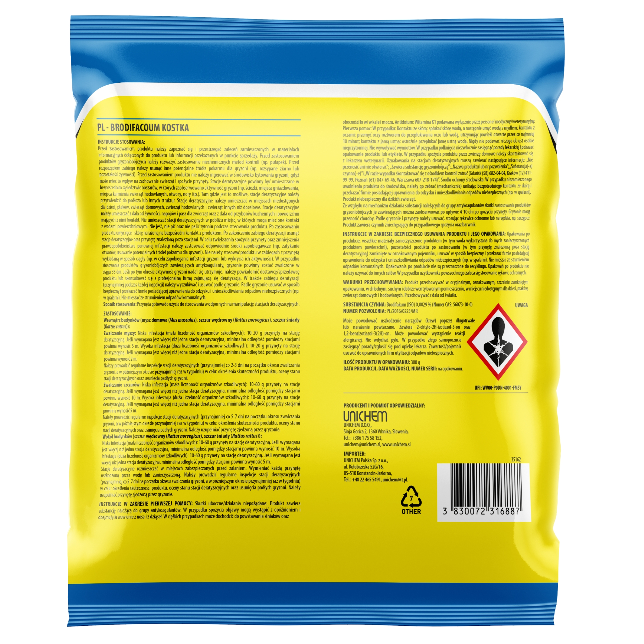 Kostka woskowa o wadze 20 g zawiera substancję czynną brodifacoum, która działa już po jednorazowym spożyciu przez gryzonia.