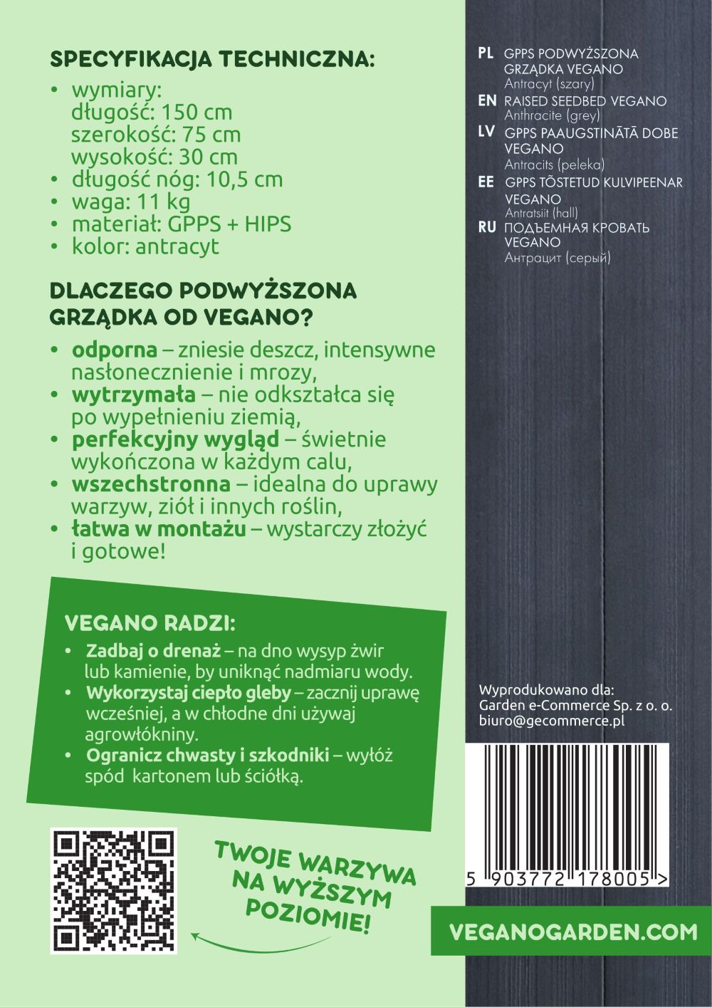Warzywniak - podwyższana grządka - szary GPPS - Vegano - 150 x 75 x 30 cm