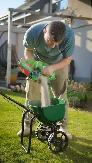 Zakładanie trawnika: Odmierz potrzebną ilość nawozu i równomiernie rozprowadź po terenie przeznaczonym pod trawnik. Wymieszaj nawóz z wierzchnią warstwą gleby (na ok. 15 cm głębokości).