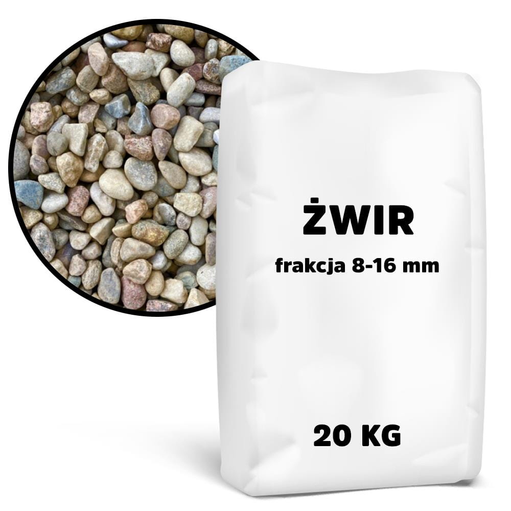 Worek zawiera 20 kg żwiru o średnicy ziaren mieszczącej się w przedziale od 8 do 16 mm.
